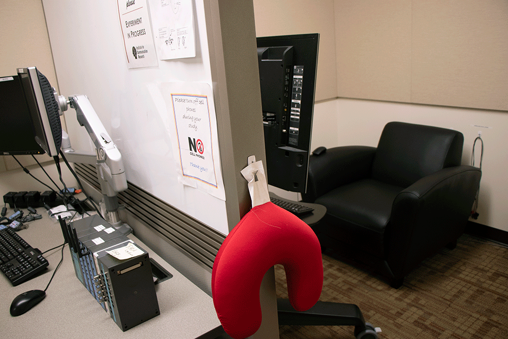 FF012C is a data collection room for psychophysiological media research. This lab room allows you to deliver visual and auditory media stimuli while tracking participants' physiological responses to the media including heart rate, skin conductance and small facial muscle movements (microexpressions) indicating emotional state.