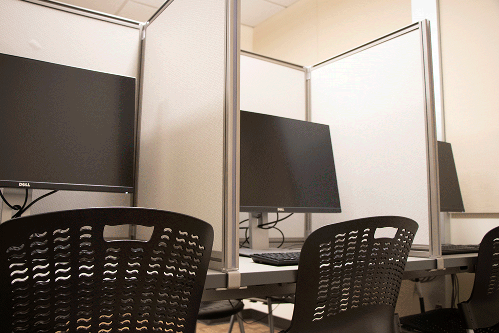 FF012N is a participant testing room equipped with eight computer stations with MediaLab and headphones, allowing for simultaneous testing for multiple participants. This testing room can be used to present participants with visual and auditory media and collect self-response data such as surveys. Each desk is divided by a privacy wall, providing privacy between participants.