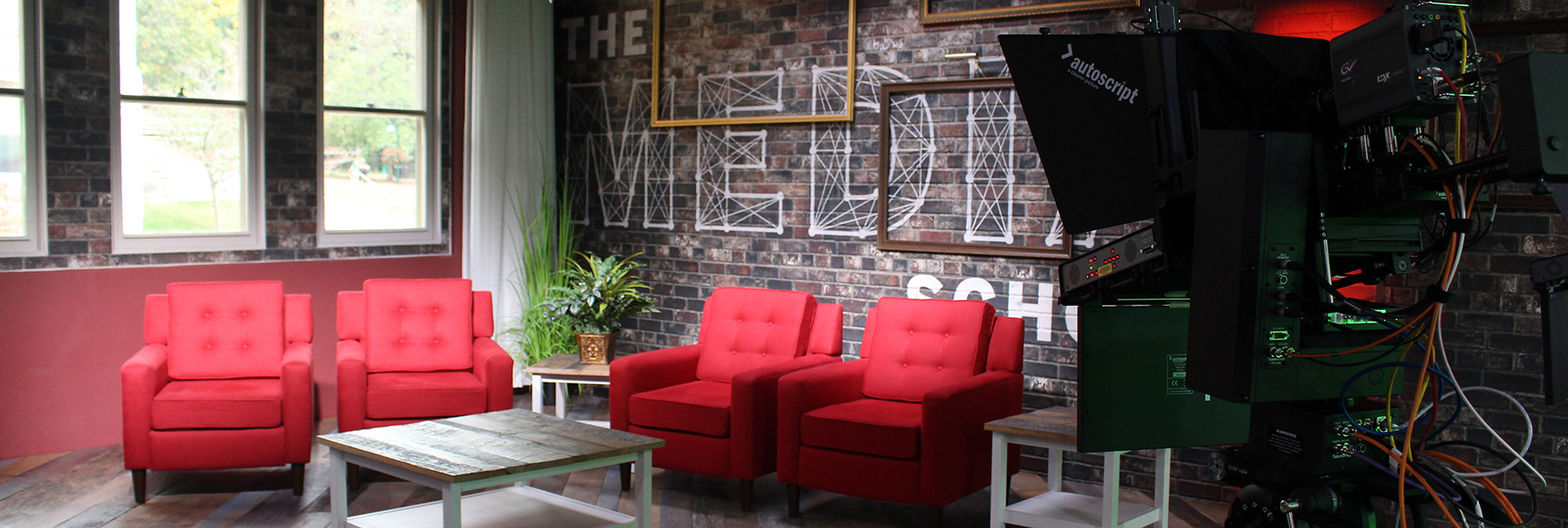 The studio’s industry-standard equipment includes four robotic cameras, a fifth camera on a jib, and the ability to connect three additional cameras in either the commons or classroom 312. RoscoVIEW polarizing filter technology provides a clear view of the Old Crescent for students to use as a backdrop.