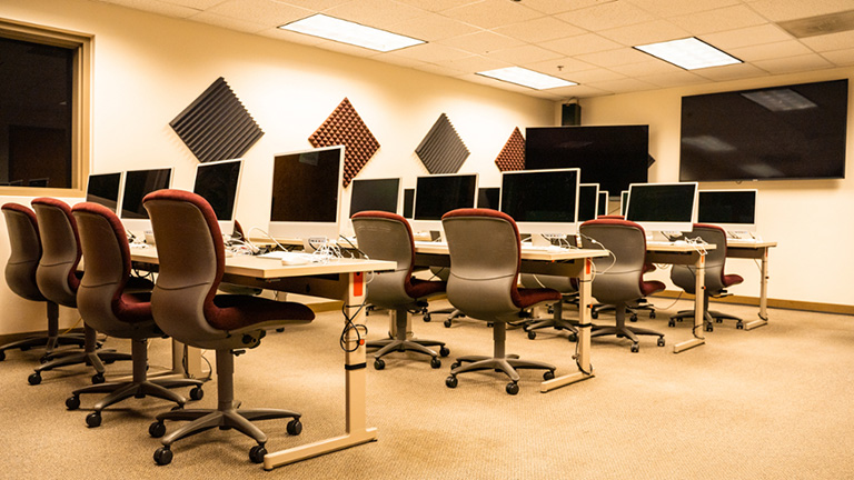 The production lab is a workspace with equipment checkout and Macintosh workstations available for class projects.