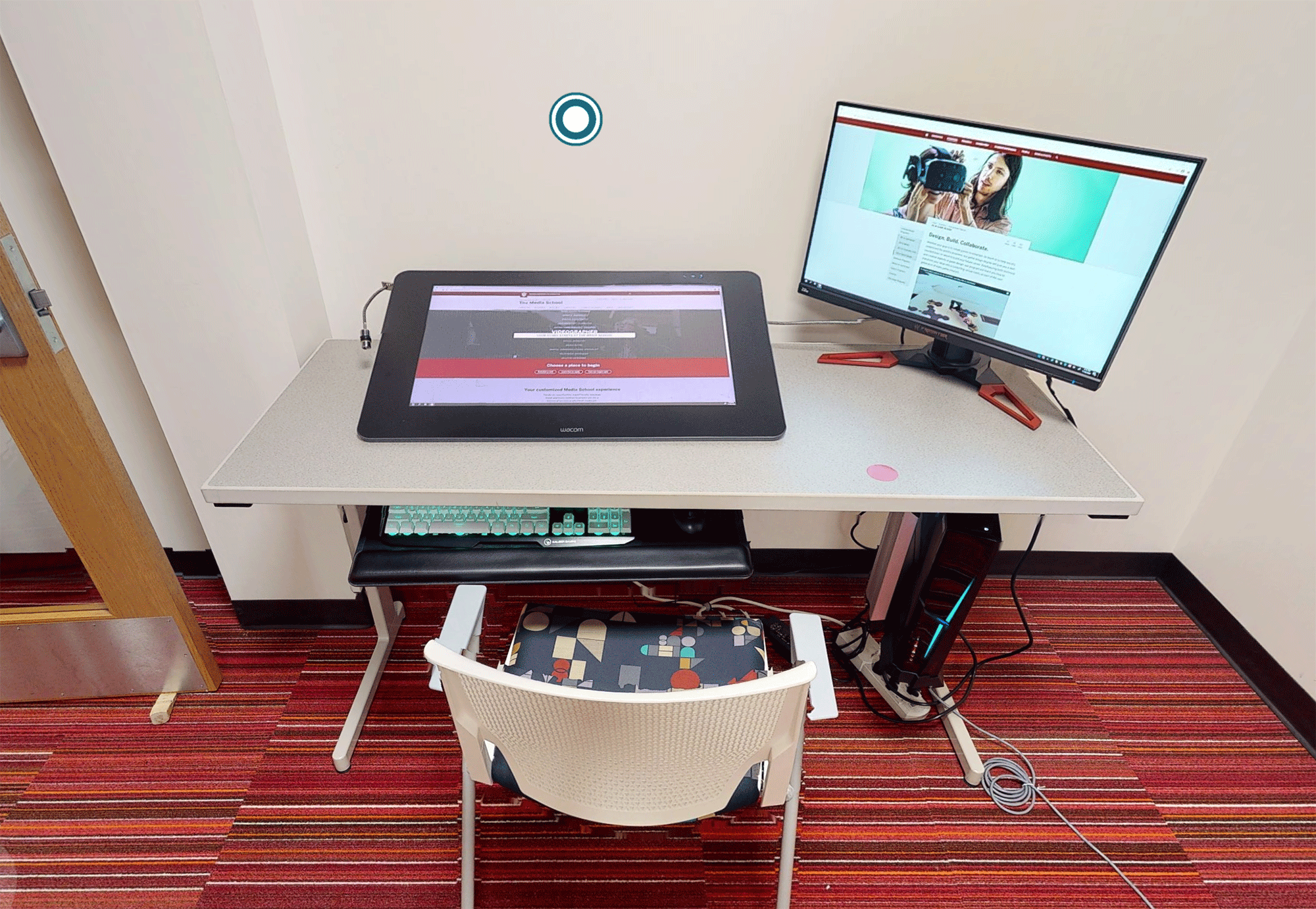 The animation studio is equipped with MSI Trident desktop computers and Wacom Cintiq graphics tablets. Students create digital paintings and sculptures with the use of a pressure-sensitive stylus.
