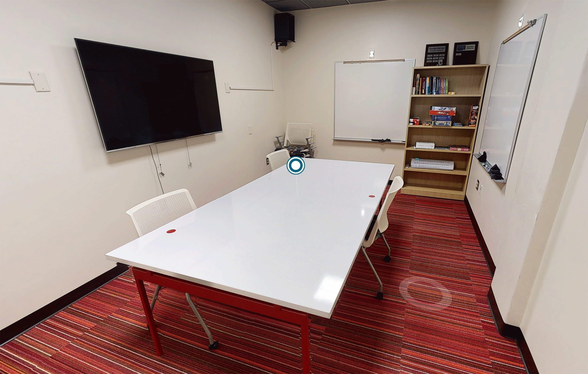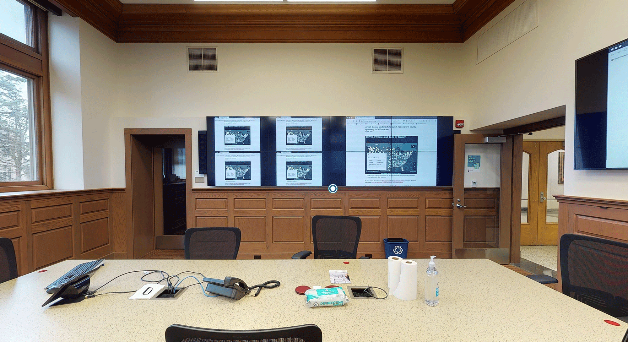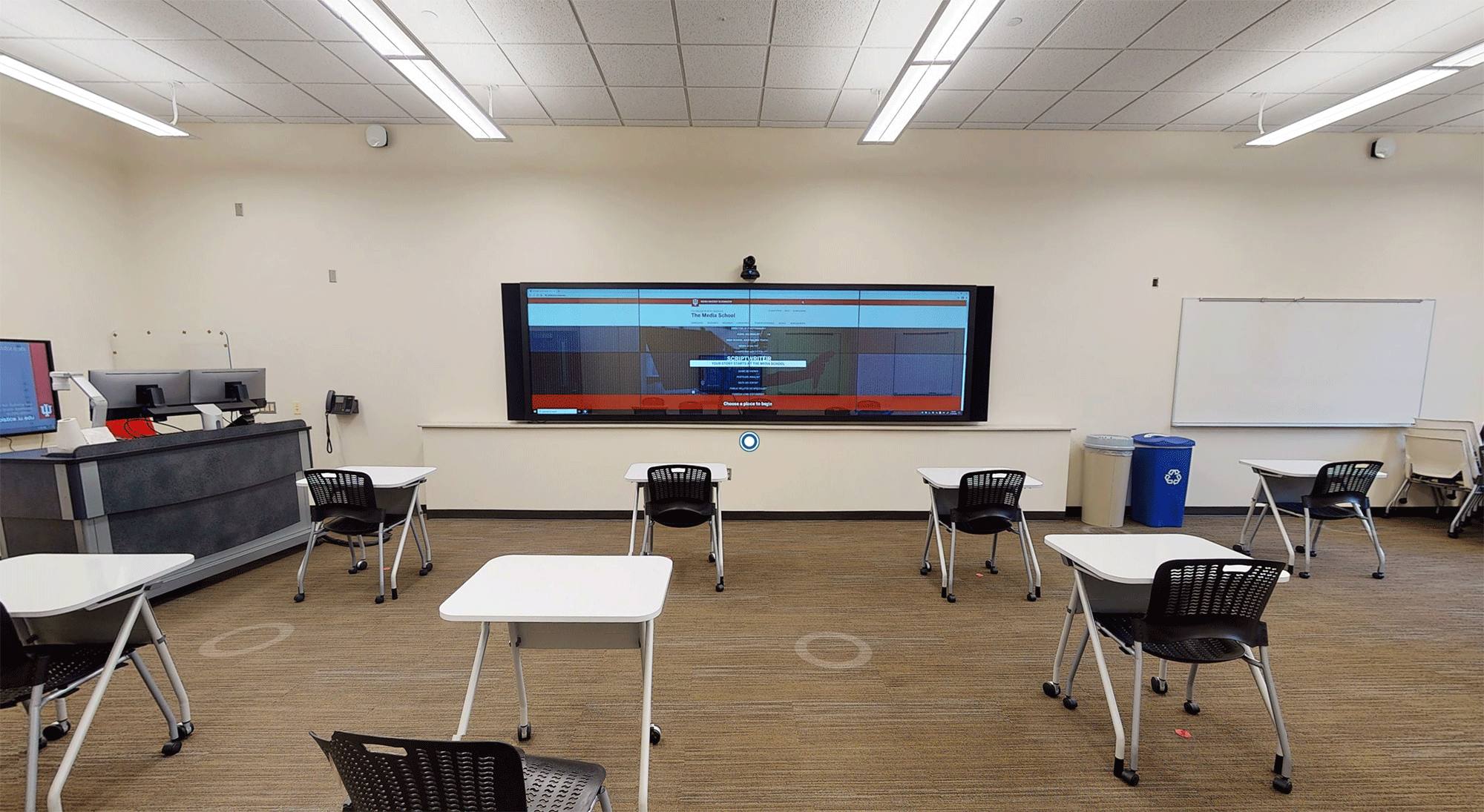 Room 114 is anchored by a 20-foot-wide, multi-touch display that encourages collaboration on visual projects. Smaller displays circle the room for group breakout sessions.
