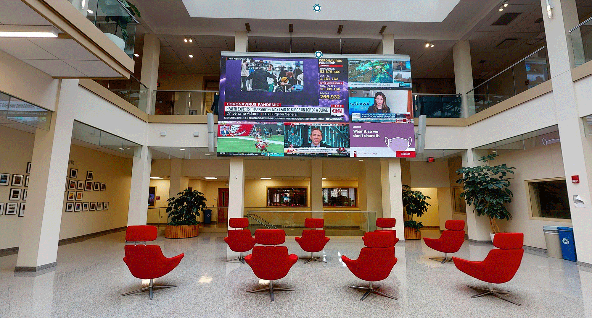 The Franklin Hall commons is the The Media School's living room — a place for gathering, collaborating and just hanging out, as well as hosting special events. Its centerpiece is a 24- by 12-foot screen that displays multiple sources of content simultaneously. At only 4 inches thick, it weighs 3,600 pounds. The commons contains a photo gray skylight, made of electrochromic glass, which adjusts the brightness of the room to account for the amount of sunlight outside.