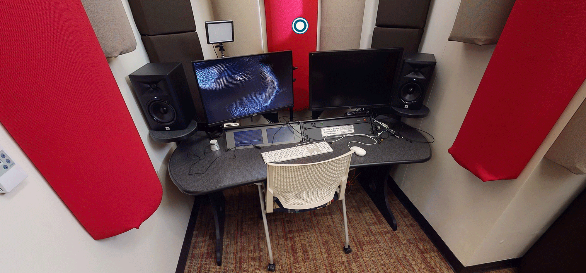Sixteen editing suites in Franklin Hall provide users quiet isolation for precision work. Thirteen of the rooms are designed for high-definition video production. UltraWide Dell monitors give editors ample desktop and timeline space. HP DreamColor monitors provide best-in-class accuracy for color grading. Every workstation is loaded with video and audio editing software, including Avid Media Composer, Final Cut Pro X, DaVinci Resolve and the complete Adobe Creative Cloud package. Each suite is also equipped with waveform monitors and vector scopes for precise adjustment of video specifications. Two of the suites use Ultra HD hardware for 4K digital cinema productions. Another is also optimized for podcast production. One room is used specifically for audio, where students can quickly and easily record voiceovers for a variety of projects.
