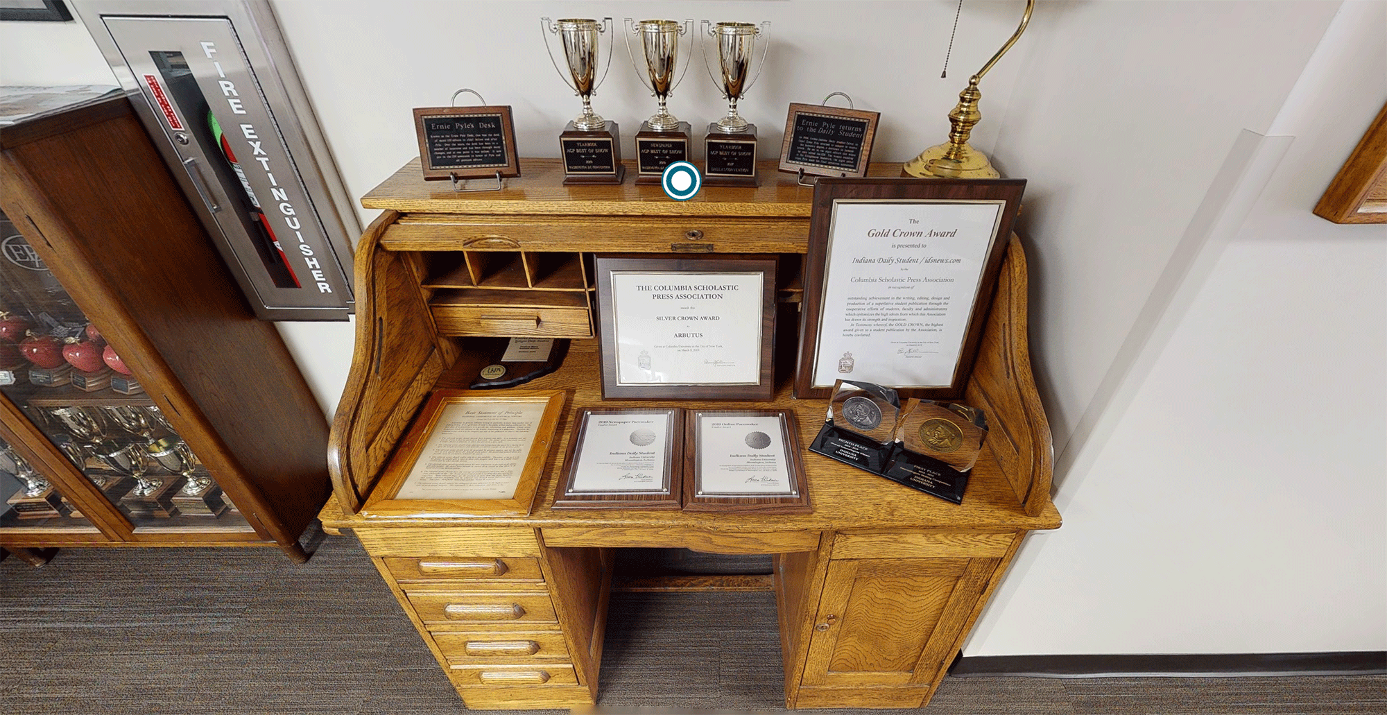 The IDS newsroom displays the desk of Ernie Pyle, the renowned World War II columnist and summer 1922 IDS editor-in-chief. By tradition, editors-in-chief sign the desk drawer after successfully completing their semester.