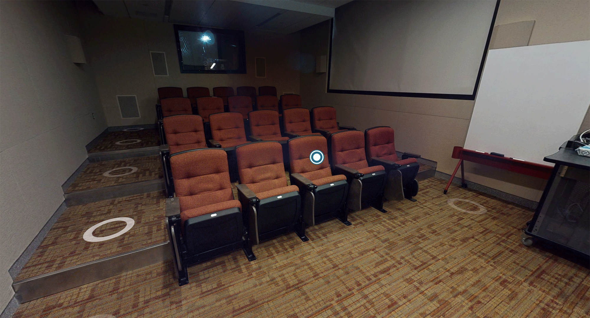 The film screening room features stadium seating for 20 people. It offers DIRECTV, two Blu-ray players and a Dolby Atmos surround sound system that supports a digital projection system or a 16 mm projector for a variety of cinematic experiences on a 14-foot screen.