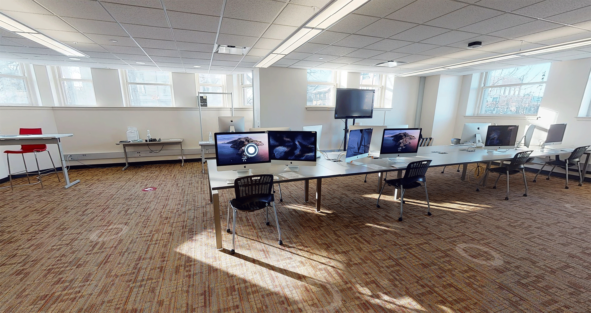 The multimedia lab has 40 5K iMac computers loaded with Adobe, Apple and DaVinci Resolve production and design software. This lab is used for individual and small-group projects.