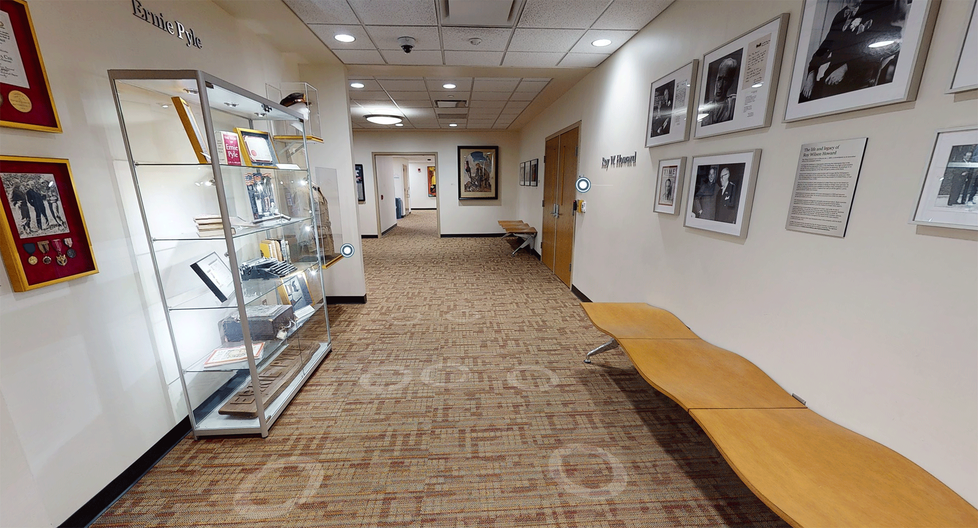 Ernie Pyle was a legendary World War II columnist, known for humanizing the war by reporting on ordinary soldiers as an embedded journalist. He is an IU alumnus. In addition to his statue that greets every visitor outside of Franklin Hall, we also have a selection of Pyle's artifacts on display, including his jacket, his watch and his Purple Heart. The Media School is proud of its close ties to journalist Roy W. Howard, an innovator who, while leading Scripps Howard Newspapers, protected the rights of a free and independent press. Yet he thought of himself as a reporter, often traveling the globe to land critical interviews with world leaders.