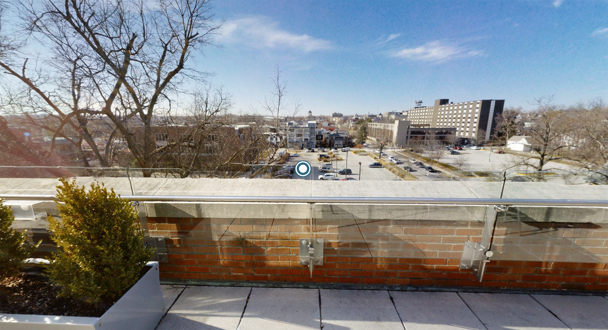 The third-floor rooftop deck offers one of the best views of Bloomington.