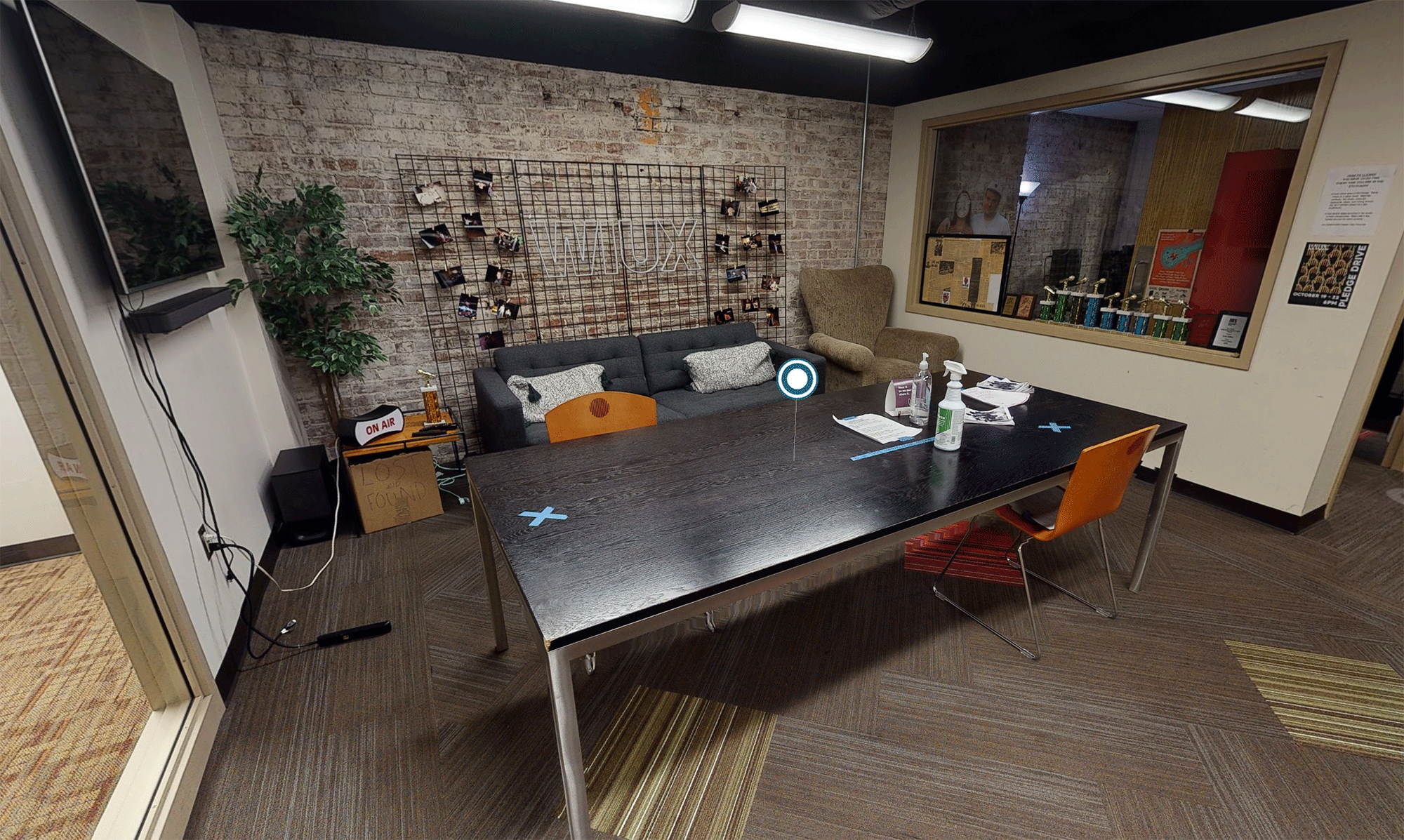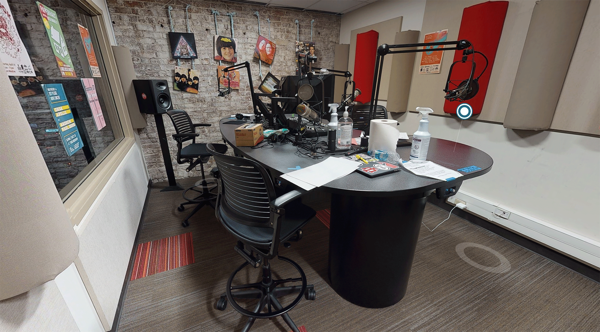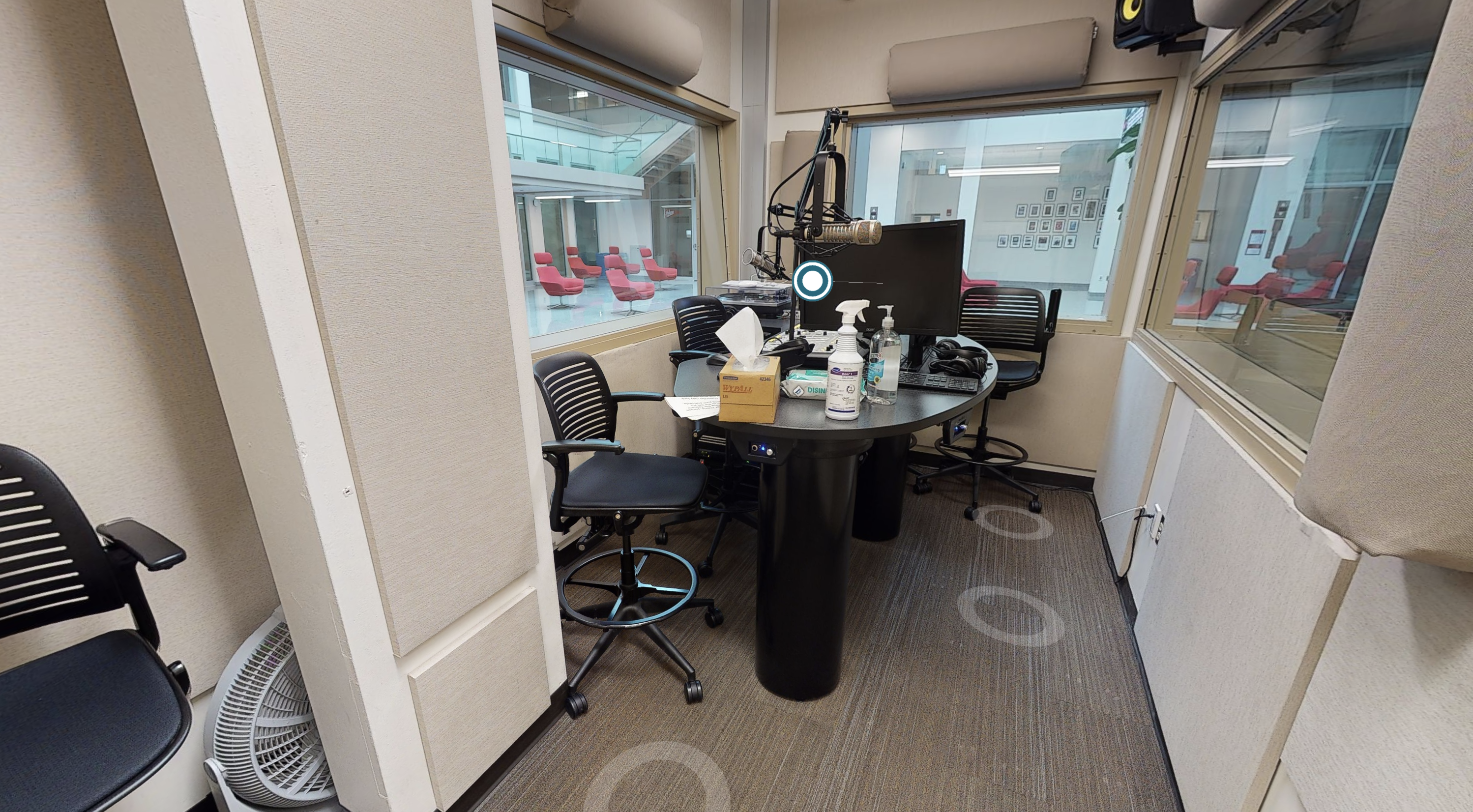 Studio 8 is a fully functional radio control room that features a 14-channel mixer designed for adaptability both on- and off-air. The space comfortably seats five on-air guests, and connections allow for multiple interviews via telephone. The studio is outfitted with CD, vinyl and digital playback devices.