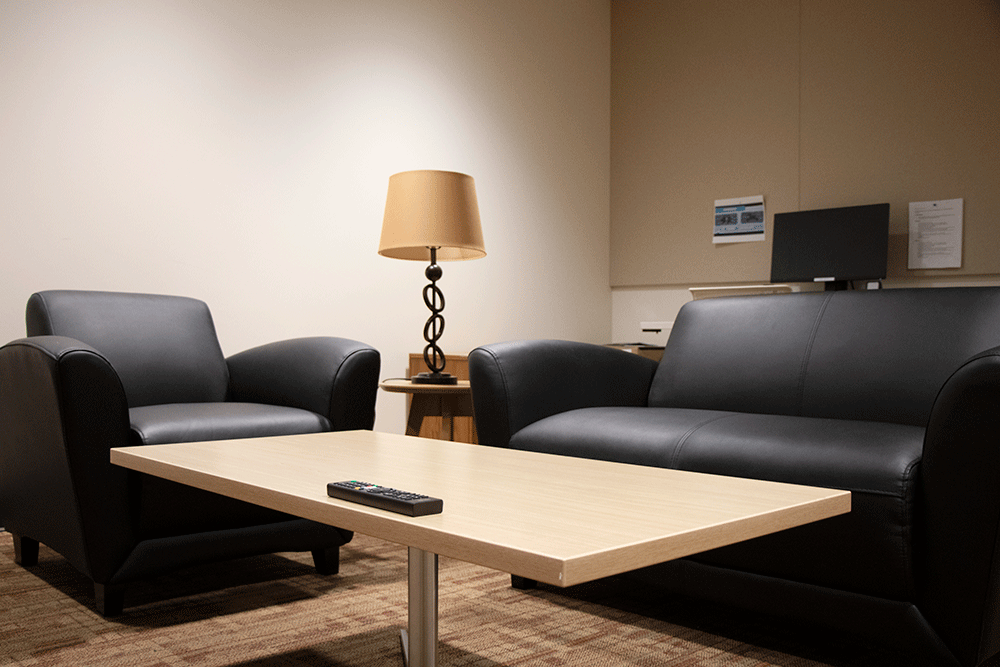 FF009 is an interview room set up to interview participants in a one-on-one or focus group in an informal living room setting including a couch, armchair, coffee table, and 62-inch TV monitor. This room includes two Sony cameras for collecting room video and audio. Extra chairs are available on request. The TV monitor can be used for group viewing of audio and visual media as well as video game play.