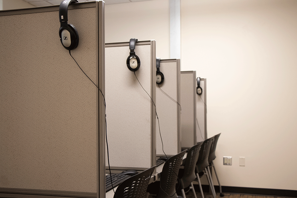 FF012M is a participant testing room equipped with eight computer stations with MediaLab, allowing for simultaneous testing for multiple participants. This testing room can be used to present participants with visual media and collect self-response data such as surveys. Each desk is divided by a privacy wall, providing privacy between participants.