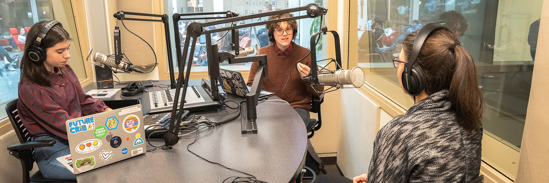 In one corner of the Franklin Hall commons sits a two-room podcast and radio production suite. Studio 8 is built as a fully functional radio control room with attached studio.