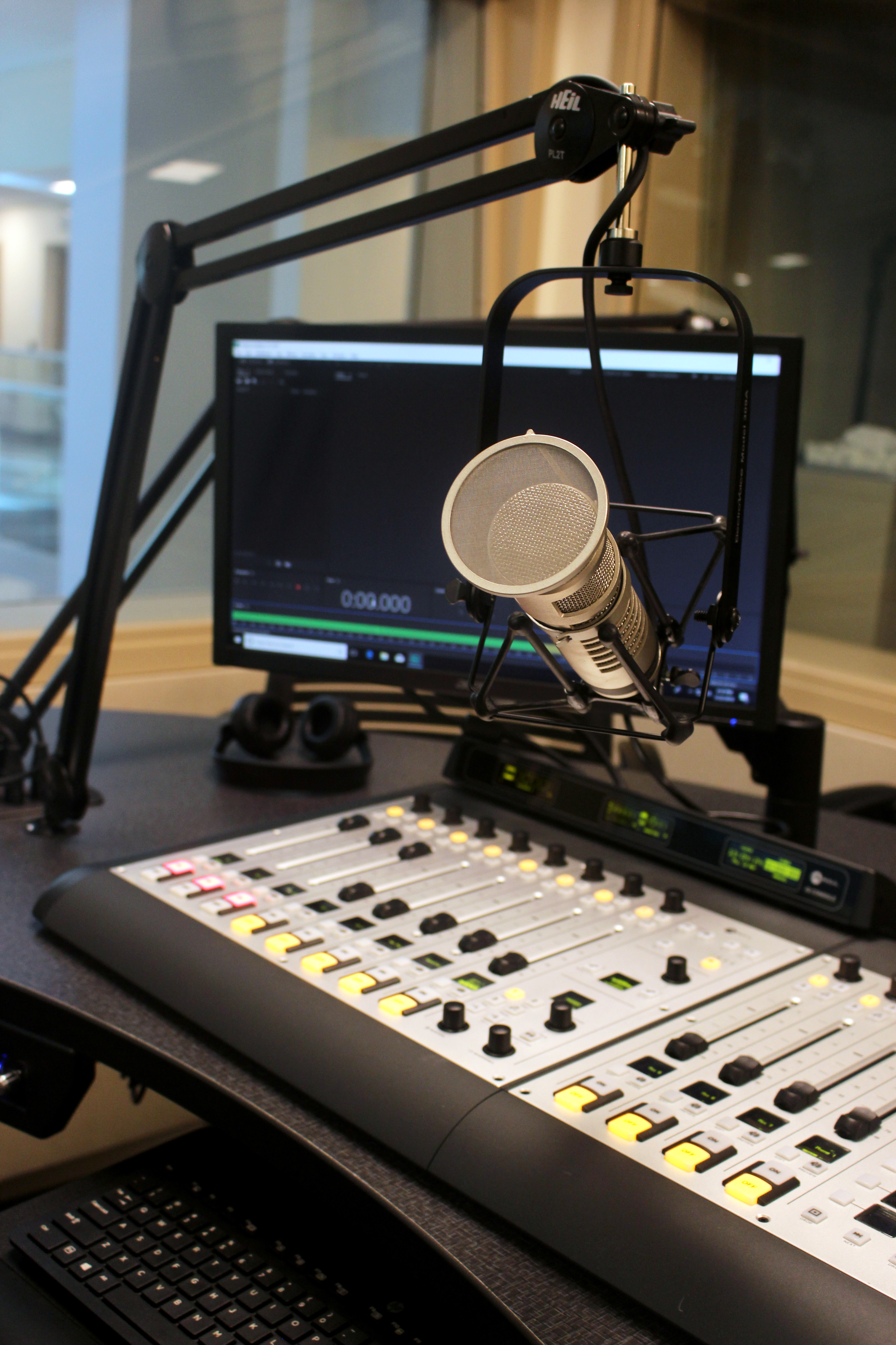 The control room comfortably seats a host and three on-air guests and features a modern 8-channel Axia iQ mixer designed for adaptability both on- and off-air. It is equipped with Electro-Voice RE27 mics, CD and digital playback devices, and a RØDECaster Pro II audio production console for podcast creation.