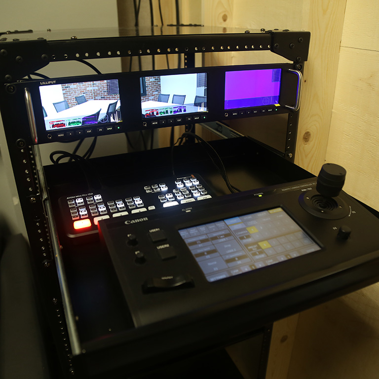 The studio’s brick façade wall features a lightbox with interchangeable backlit graphics. Two custom-built shelving units on the opposite side of the studio contain hidden PTZ cameras. The PTZ cameras are connected to a small camera switcher and monitor system which allows for live cutting between the two cameras and makes the studio an ideal space for recording interviews. The versatile lighting grid features bi-color lights and can be controlled via a smartphone or tablet with the Sidus Link app.