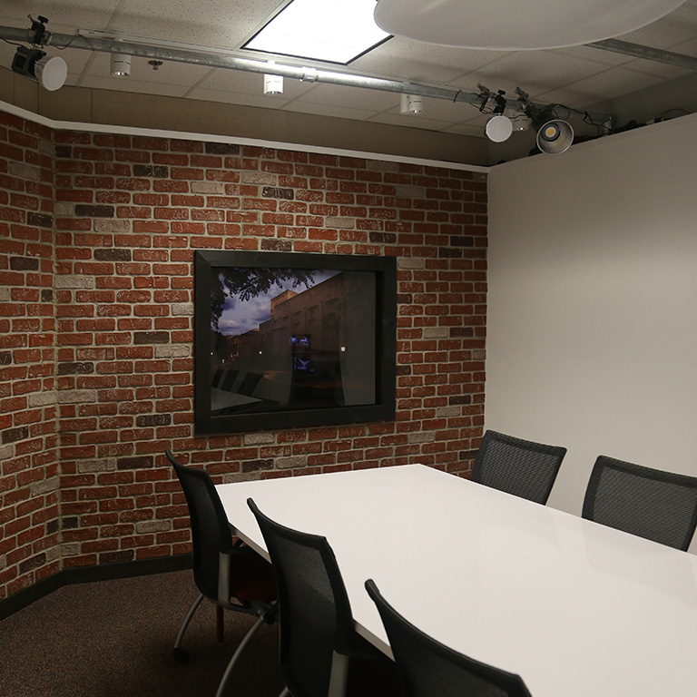 Studio 5A was created in response to an increased need for student-reservable studio space. This multi-use studio is designed in the style of a conference room or office space but can be transformed into a variety of different settings with props and furniture.