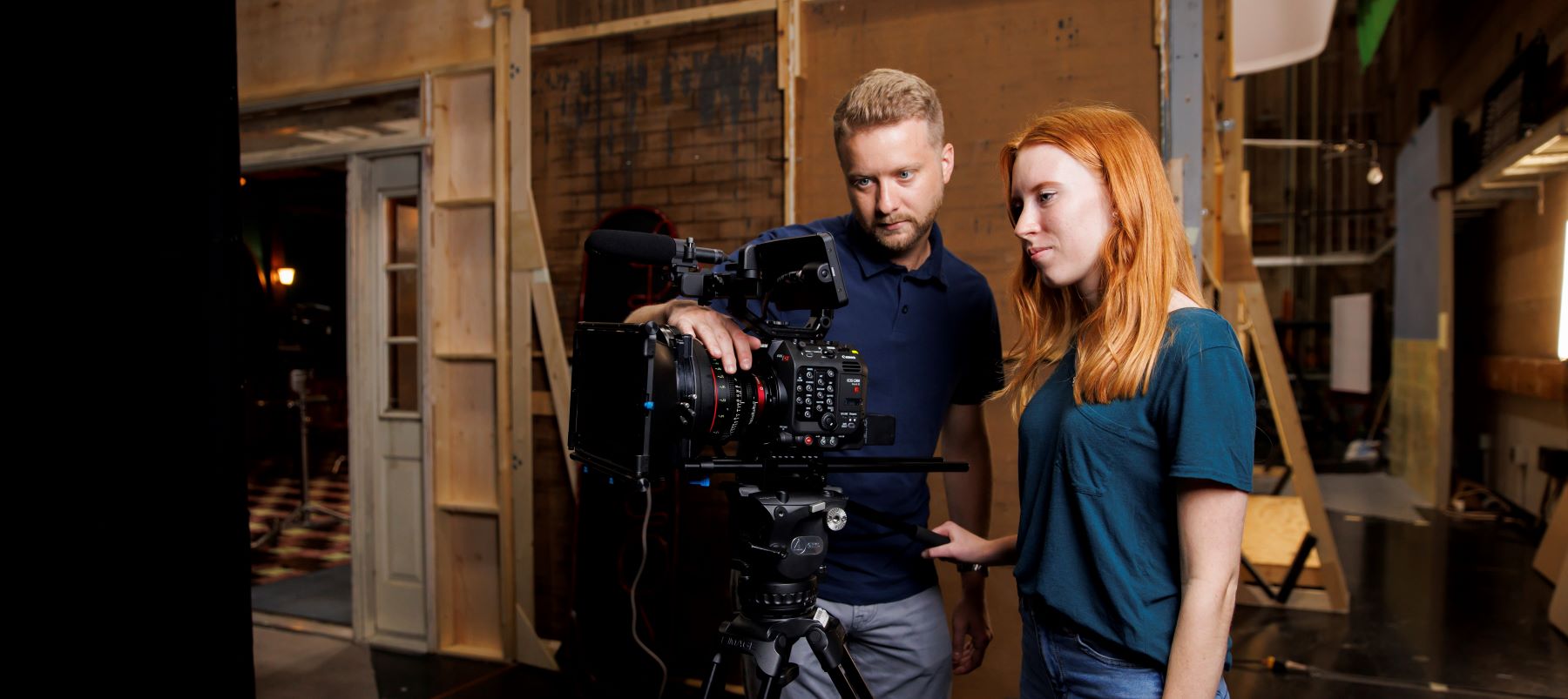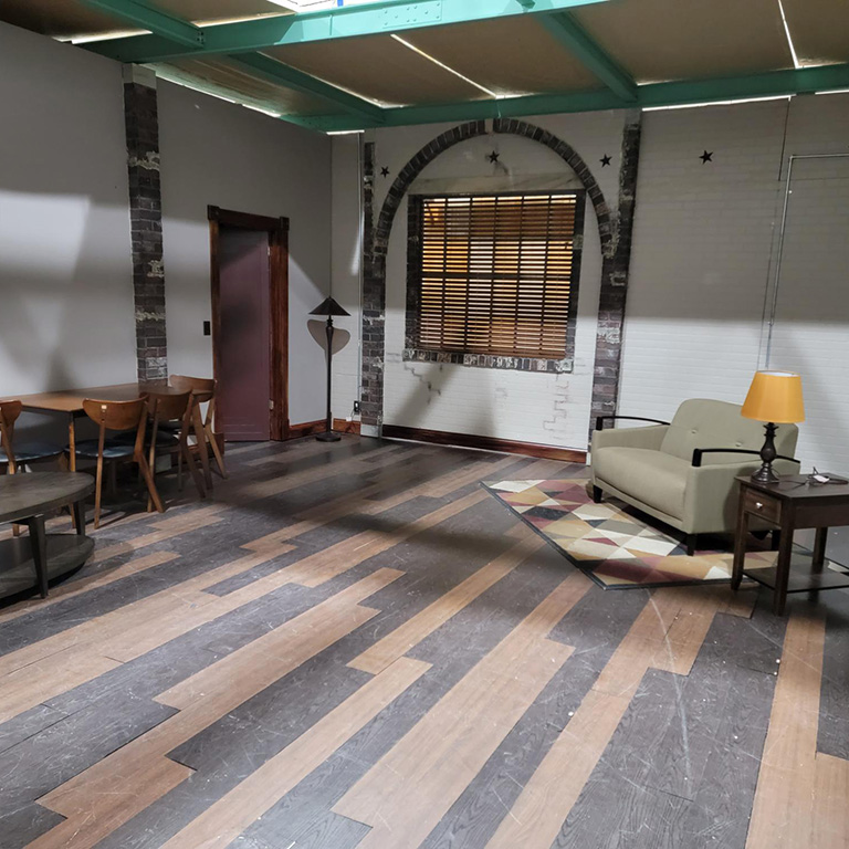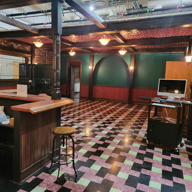 Studio 5 is a 2,800-square-foot studio that recently was converted into a two-set soundstage. Students can film projects with complete control over their productions, including design. The soundstage features movable ceiling panels, walls, and windows, as well as a restaurant pub set and an apartment set customizable to student project needs.